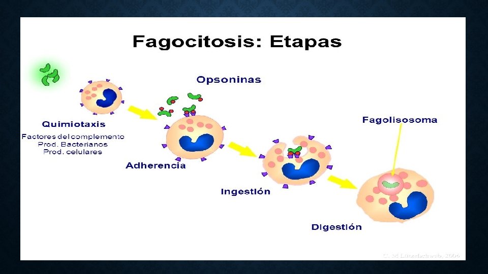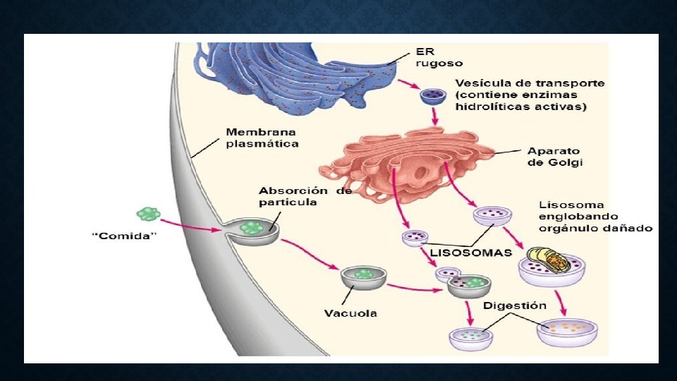 LISOSOMAS • Son organelos vesiculares que se forman por la rotura del aparato de Golgi y después se dispersan por todo el citoplasma. • Los lisosomas constituyen el aparato digestivo intracelular que permite que la célula digiera: 1. Estructuras celulares dañadas. 2. Partículas de alimentos que ha ingerido. 3. Las sustancias no deseadas como las bacterias.