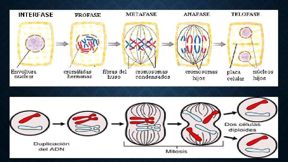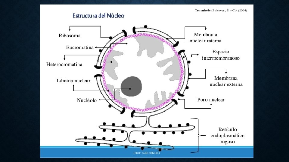 NÚCLEO • Es el centro de control de la célula. • Contiene en su interior grandes cantidades de ADN (Genes) • Controla las actividades plasmáticas de la célula. • Controla y promueve la reproducción de la célula. • Organiza los genes en cromosomas. • Transporta factores químicos de regulación a través de sus poros. • Produce ARN Mensajero (ARNm).