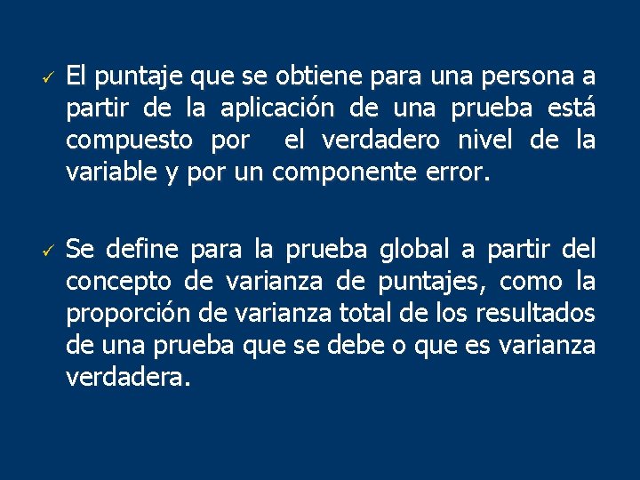 ü ü El puntaje que se obtiene para una persona a partir de la aplicación de una prueba está compuesto por el verdadero nivel de la variable y por un componente error. Se define para la prueba global a partir del concepto de varianza de puntajes, como la proporción de varianza total de los resultados de una prueba que se debe o que es varianza verdadera.