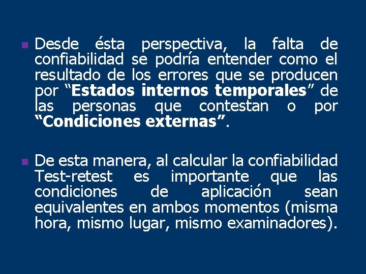 n n Desde ésta perspectiva, la falta de confiabilidad se podría entender como el resultado de los errores que se producen por “Estados internos temporales” de las personas que contestan o por “Condiciones externas”. De esta manera, al calcular la confiabilidad Test-retest es importante que las condiciones de aplicación sean equivalentes en ambos momentos (misma hora, mismo lugar, mismo examinadores).