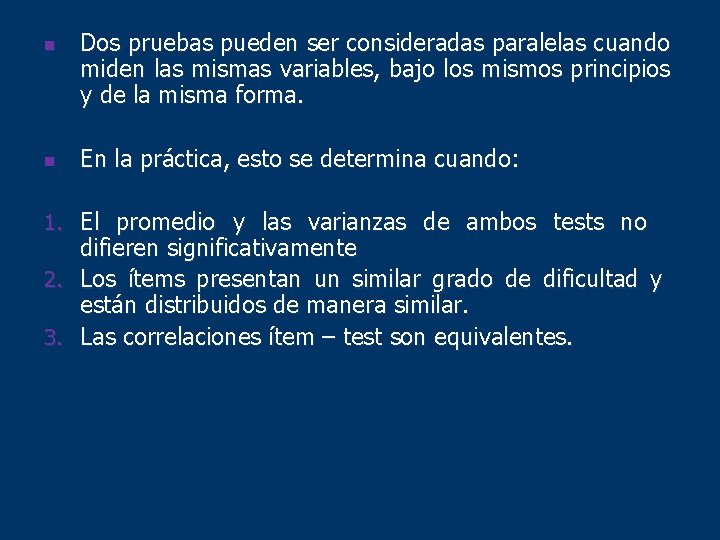 n n Dos pruebas pueden ser consideradas paralelas cuando miden las mismas variables, bajo los mismos principios y de la misma forma. En la práctica, esto se determina cuando: 1. El promedio y las varianzas de ambos tests no difieren significativamente 2. Los ítems presentan un similar grado de dificultad y están distribuidos de manera similar. 3. Las correlaciones ítem – test son equivalentes.