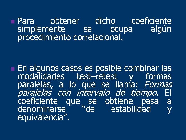 n n Para obtener dicho coeficiente simplemente se ocupa algún procedimiento correlacional. En algunos casos es posible combinar las modalidades test–retest y formas paralelas, a lo que se llama: Formas paralelas con intervalo de tiempo. El coeficiente que se obtiene pasa a denominarse “de estabilidad y equivalencia”.