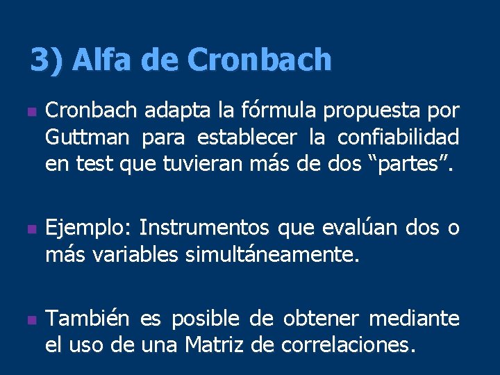 3) Alfa de Cronbach n n n Cronbach adapta la fórmula propuesta por Guttman para establecer la confiabilidad en test que tuvieran más de dos “partes”. Ejemplo: Instrumentos que evalúan dos o más variables simultáneamente. También es posible de obtener mediante el uso de una Matriz de correlaciones.