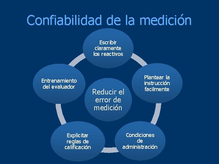 Confiabilidad de la medición Escribir claramente los reactivos Entrenamiento del evaluador Explicitar reglas de calificación Reducir el error de medición Plantear la instrucción facilmente Condiciones de administración