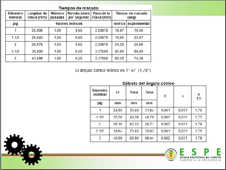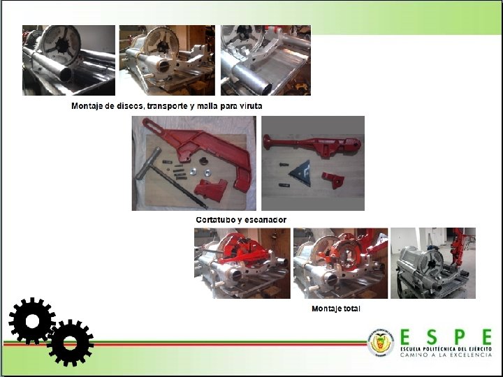 CONCLUSIONES • Basándose en las normas que se aplican para cada caso, se realizó el diseño mecánico de todas las partes a fabricar y seleccionar aquellas que se adquirieron mediante catálogo. • Respaldándose en el diseño realizado, se fabricaron determinadas partes, posterior a un análisis de costos, se adquirió otras a medio uso en excelente estado, finalmente se compraron mediante catálogo las propuestas y al contar con todos los elementos se ensambló la máquina, luego de lo cual fue puesta en marcha para efectuar las pruebas respectivas que garanticen un adecuado desempeño, así como un correcto maquinado de la tubería.