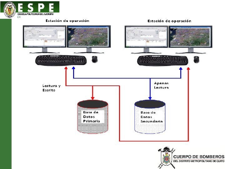 Sistema de Atención y Gestión de Emergencias ERB Satélite GPS Trunking Centro de Operaciones del CB de Quito Sistema de Radio Atención ( 05 Administrador Despachadores ) ( 02 - S / Telefonista ) ( 01 ) - S / Despachador WAN Vehículos de Bomberos Red I / CAD – LAN 100 Mpbs Servidores de Base Servidor de AVL · S / Rastreador Sistema de Radio de Datos ( Primario y Secundario ) · · S / Gerenciador 2 ( AVL / GPS )