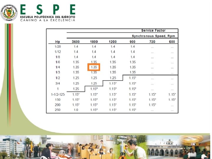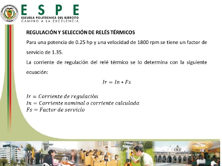 RELÉ TÉRMICO El relé térmico es un elemento que protege al receptor contra sobre intensidades que siempre son inferiores a las intensidades de cortocircuito y que de tener una duración en el tiempo, podrían ser causa de riesgo de avería para el receptor. REGULACIÓN Y SELECCIÓN DE RELÉS TÉRMICOS La norma NEMA MG-1 es la que define el factor de servicio para motores y generadores, en la siguiente Figura el factor de servicio se asocia a cada potencia y velocidad.