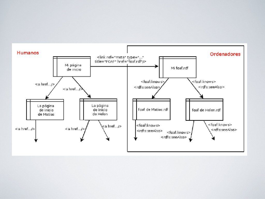 FOAF – Friend Of A Friend “Friend Of A Friend es un proyecto que pretende crear una Web de documentos que sean entendibles por ordenadores, los cuales describan a personas, relaciones entre ellas y las cosas que ellas crean y hacen”.