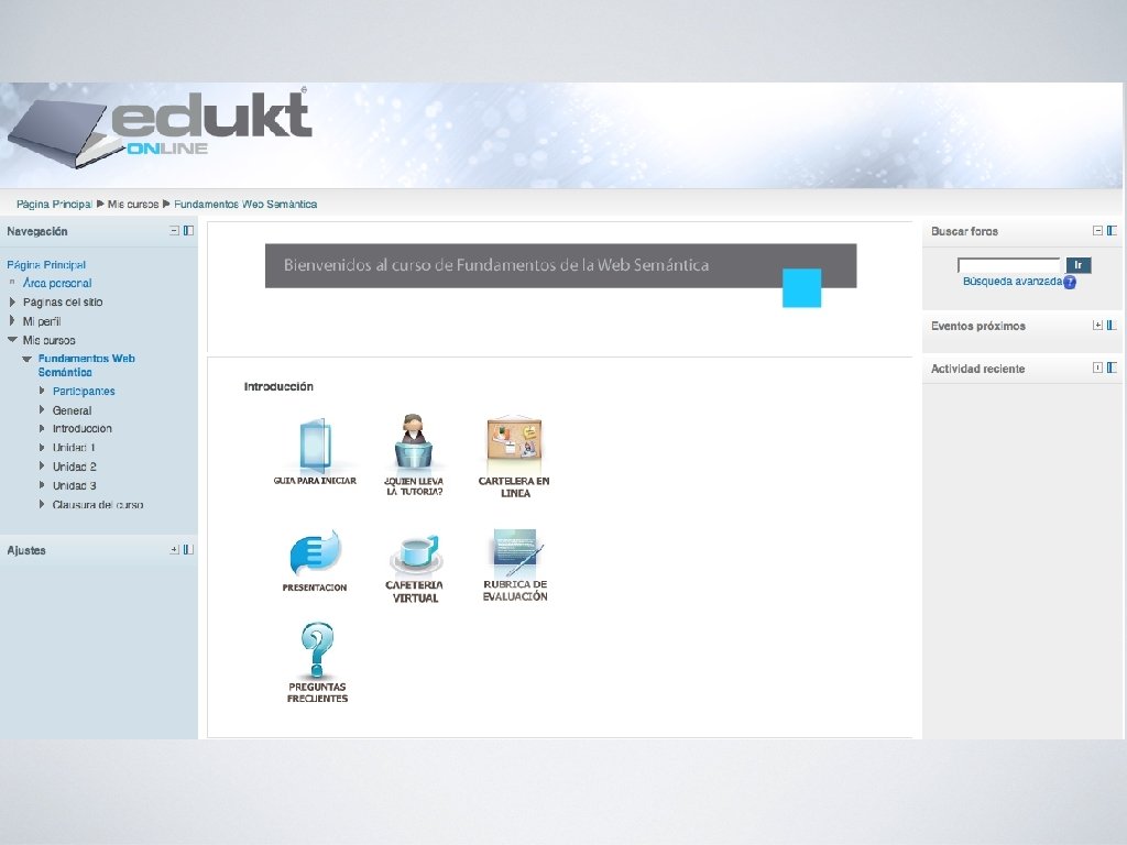 • El curso on-line “Fundamentos de la Web Semántica” fue desarrollado e implementado en la plataforma de tele-formación Moodle 2. 3 de VLBS - Virtual Learning & Business Solutions, utilizando herramientas web 2. 0 y las metodologías OOHDM y PACIE. • La metodología que acompaña y guía el desarrollo de un producto software es muy importante, ya que de esta depende el éxito del producto.