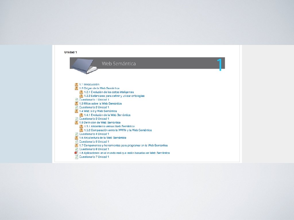• Investigación bibliográfica sobre los principales conceptos referentes a la Web Semántica. • Definir estado del arte de la Web Semántica • Curso on-line: • • Bloque 0 o PACIE • Bloque académico • Bloque de cierre Prototipo experimental