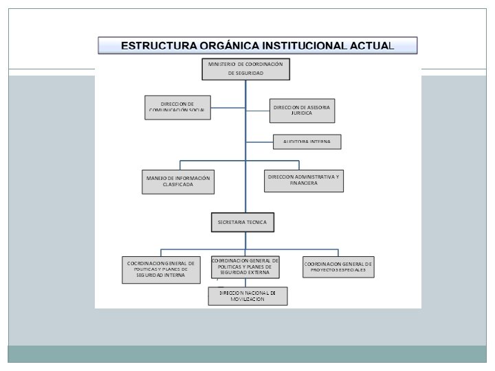 MAPA DE RELACIONAMIENTO INTERINSTITUCIONAL CON ACTORES FUERA DEL GABINETE Sector Privado MINISTERIO COORDINADOR DE SEGURIDAD Otros Consejos Sectoriales Articular las políticas, planes, programas y proyectos intersectoriales Gobiernos Autónomos Descentraliz ados Suscribir convenios, acuerdos, agendas Registro de Organismos del Estado Suscribir convenios, acuerdos, y gestión de proyectos Gestionar instrumentos para la seguridad Organismos Internacionales y Regionales Suscribir convenios y acuerdos Organizaciones No Gubernamental es Suscribir convenios y acuerdos