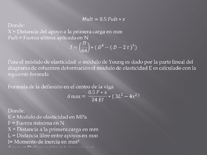 MEDICIÓN EN VIGA QUE DIVIDE A LA CARGA EN DOS PUNTOS La carga sobre el tronco de bambú debe ser constante a una confiabilidad de 1% esto quiere decir que se vaya tomando rango de carga para ir midiendo la deformación producida a esa carga esta taza puede ser a 0. 05 milímetros / segundo y ser la carga máxima a la cual falla la guadua. Después de la prueba se vuelve a a medir D el diámetro externo y el d diámetro interno. Determinar el contenido de humedad que debe estar alrededor del 30%