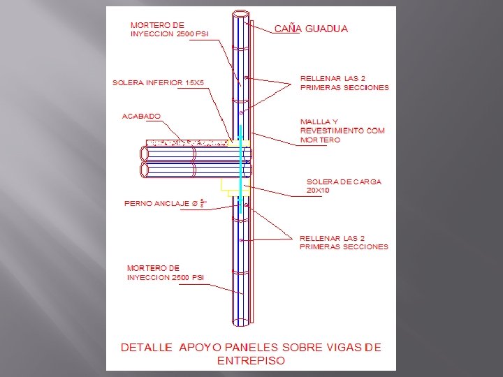 • Se construirá una losa compuesta por vigas soleras de madera y viguetas de guadua. • La losa de entrepiso debe comportarse como un diafragma en su propio plano y ofrecer así un buen comportamiento de la estructura para una correcta utilización de todos los muros estructurales, para tal defecto debe proveerse el adecuado amarre de los elementos que la componen, debe considerarse también la correcta distribución de esta para soportar las cargas verticales (muerta y viva). • Los entrepisos están compuestos por un conjunto de viguetas de guadua, separadas entre sí máximo 40 cm; se deben usar mínimo dos superpuestas verticalmente y aseguradas por medio de un zuncho metálico; encargadas de soportar directamente las cargas del entrepiso, como son: acabados (esterilla, mortero y refuerzo) y las cargas vivas. • Las viguetas descansan sobre las vigas soleras que a su vez se apoyan sobre las carreras superiores de los muros estructurales del primer piso; para el caso de las dos soleras se recomienda construirlas en madera densa, ya que cuando son elaboradas en guadua se corre el riesgo de sufre aplastamientos; se nota corte del entrepiso con viguetas de guadua.