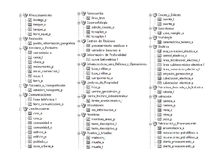 Objetivos Específicos • Recopilar la información disponible sobre las características y operación de los aprovechamientos hidroeléctricos públicos y privados. • Analizar y estandarizar la información existente sobre los aprovechamientos hidroeléctricos. • Generar un Catálogo de los aprovechamientos hidroeléctricos del Ecuador, con base en las especificaciones del Catálogo de Objetos del IGM. • Estructurar y Catalogar toda la información geográfica. • Elaborar una base de datos de los complejos hidroeléctricos, que comprende las siguientes obras: presas, embalses, obras de captación, casas de maquinas, potencia nominal, potencia efectiva, energía generada y otros.