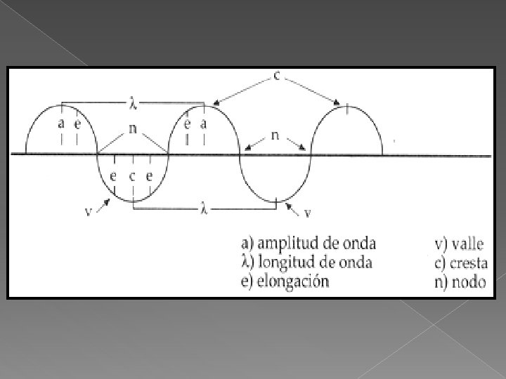 � � � � � La posición más alta con respecto a la posición de equilibrio se llama cresta. El ciclo es una oscilación, o viaje completo de ida y vuelta. La posición más baja con respecto a la posición de equilibrio se llama valle. El máximo alejamiento de cada partícula con respecto a la posición de equilibrio se llama amplitud de onda. El periodo es el tiempo transcurrido entre la emisión de dos ondas consecutivas. Al número de ondas emitidas en cada segundo se le denomina frecuencia. La distancia que hay entre cresta y cresta, o valle y valle, se llama longitud de onda. Nodo es el punto donde la onda cruza la línea de equilibrio. Elongación es la distancia que hay, en forma perpendicular, entre un punto de la onda y la línea de equilibrio.