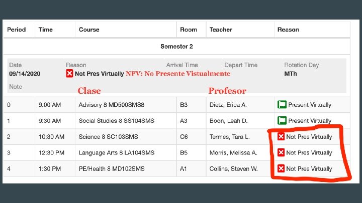 Cómo verificar la asistencia / Terminos importantes: Asistencia = Attendance PV: Presente Virtualmente NPV: No Presente Virtualmente