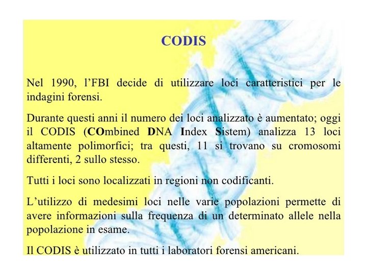 “DNA fingerprint” con i MINISATELLITI come prove legali Nel 1986, Richard Buckland fu S 1 =DNA da sospetto 1 S 2 =DNA da sospetto 2 E(vs) =DNA da prove raccolte sul luogo del crimine assolto per lo stupro e l'omicidio di un adolescente vicino a Leicester, la città in cui profilo del DNA è stato scoperto (Alec Jeffreys). E’ stato il primo utilizzo del DNA fingerprinting in un'indagine penale. Nel 1987, nello stesso caso. Buckland, un panettiere britannico Colin Pitchfork è stato il primo criminale catturato e condannato con impronta digitale del DNA. Nel 1993 i tribunali degli USA hanno accettato per la prima volta l’analisi del DNA nei processi per omicidio e per violenza sessuale. In Italia, solo nel 2009, è stata inserita la prova del DNA nella legge 85! Recentemente si è legiferato per la banca dati del DNA.
