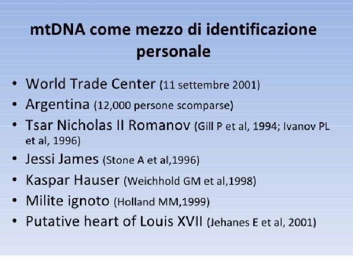TANTI MITOCONDRI PER CELLULA: ci possono essere mitocondri con sequenza di basi differenti in una medesima posizione (eteroplasmia). Il primo caso di eteroplasmia osservata riguarda l'analisi dei resti dei Romanov (Gill et al. , 1994). I discendenti: possono ereditare una proporzione variabile delle 2 popolazioni e nel corso del tempo una popolazione può fissarsi a scapito di un'altra, ripristinando una condizione di omoplasmia.