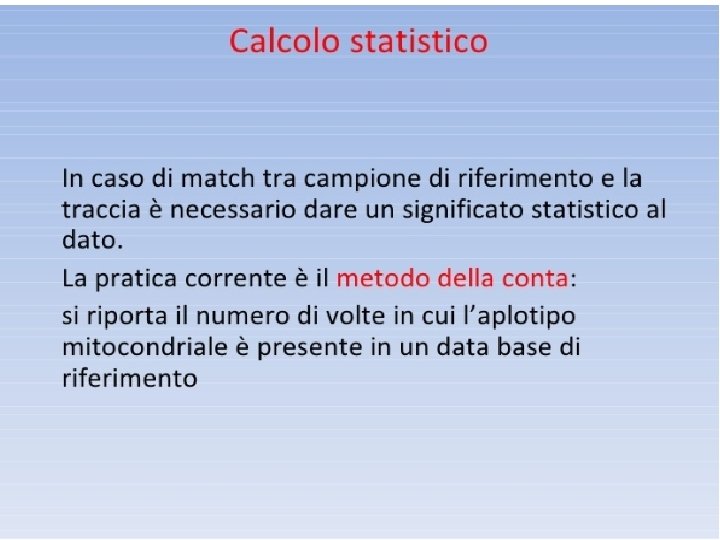 Valutazione statistica dei confronti (Q vs K) ESCLUSIONE: I 2 campioni differiscono nella sequenze di mt. DNA per più posizioni nucleotidiche si può escludere che derivino dalla stessa sorgente INCONCLUSIVO: se differiscono per 1 sola posizione nucleotidica, il dato è inconclusivo, mutazione? ? ? Conviene analizzare altri tessuti NON ESCLUSIONE: se sono identici, se 1 dei due presenta eteroplasmia in una posizione nucleotidica non si esclude che derivino dalla stessa sorgente. Tuttavia se entrambi i campioni presentano eteroplasmia nella stessa posizione, ciò rafforza che derivino dalla stessa sorgente.