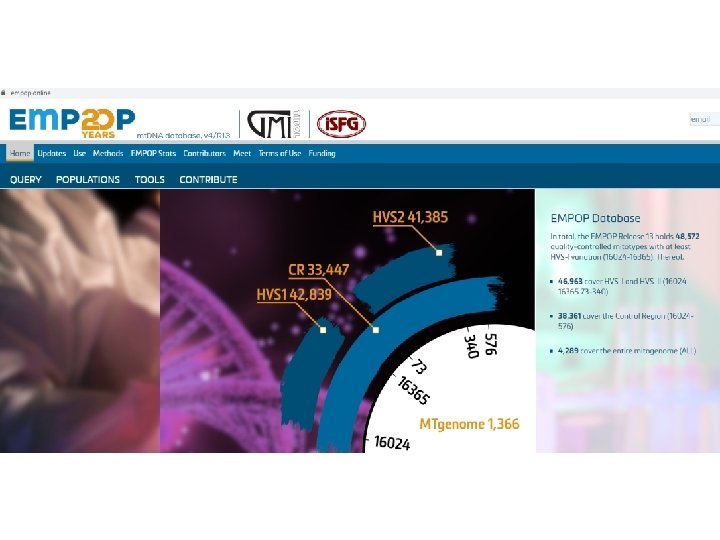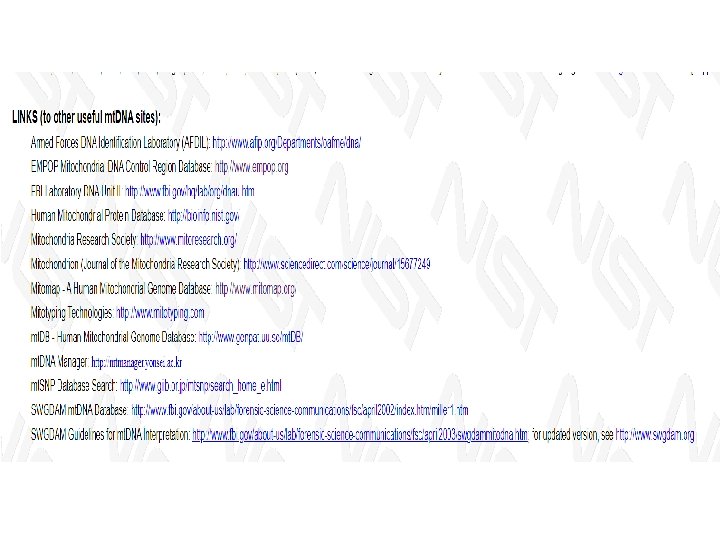 Confronto col database Database di profili aplotipici e/o frequenze aplotipiche: 1. FBI Forensic mt. DNA Database: a) sezione criminale; b) sezione con accesso al pubblico 2. MITOMAP: raccolta completa delle mutazioni del umano: a) uso clinico b) uso forense 3. EMPOP: archivi disponibili di Database di popolazione: fornisce risultati che possono essere utilizzati per verificare la QUALITA’ dei dati di una sequenza mt. DNA. (16 ottobre 2006, http: //www. empop. org).