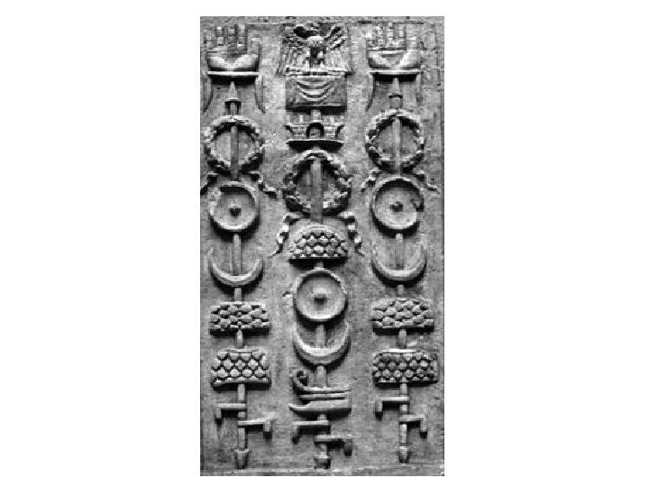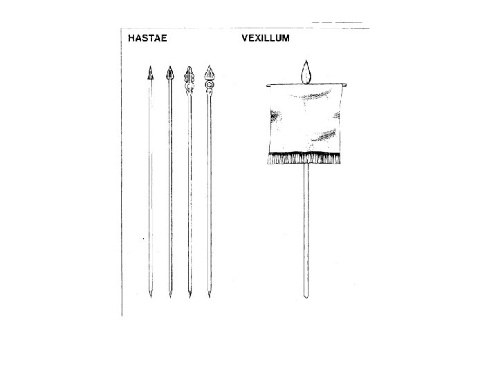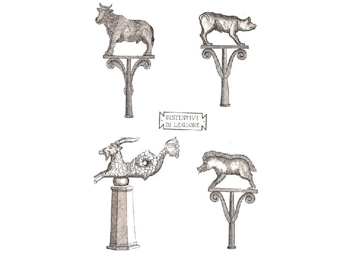 AQUILA: simboleggiava l'intera legione; VEXILLA: 10 bandiere per 10 coorti; SIGNA: 60 bandiere minori per le 60 centurie, 10 bandiere minori per le 10 turmae. • Le bandiere servivano a trasmettere degli ordini sul campo di battaglia • Il signifer portava il signum e indicava ai fanti il cammino da seguire nella marcia e in battaglia • Il vexillarius portava il vexillum e indicava la direzione ai cavalieri