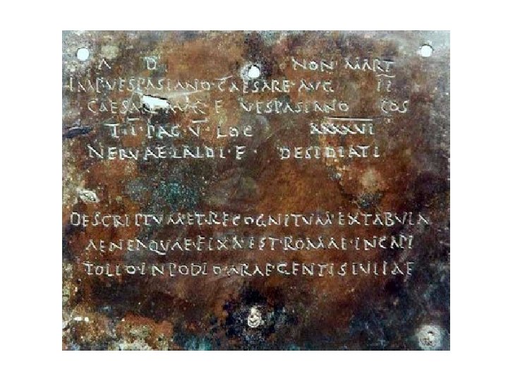 CIL , X 1402 (7 marzo del 70 d. C. ) Parte interna: IMP VESPASIANVS CAESAR AVGVST TRIBVNIC POTEST COS II VETERANIS QVI MILITAVERUNT IN LEG II ADIVTRICE PIA FIDELE QVI VICENA STIPENDIA AVT PLVRA MERVERANT ET SVNT DIMISSI HONESTA MISSIONE QVORUM NOMINA SVBSCRIPTA SVNT IPSIS LIBERIS POSTERISQVE EORVM CIVITATEM DEDIT ET CONVBIVM CVM VXORIBVS QVAS TVNC HABVISSENT [CV]M EST CIVITA[S] [I]IS DATA AVT SI QVI CAELIBES ESSEN[T] [CV]M IIS QVAS POSTEA DVXISSENT DVM TAXAT SINGVLI SINGVLAS A D NON MART IMP VESPASIANO CAESARE AVG II CAESARE AVG F VESPASIANO COS T I PAG V LOC XXXXVI NERVAE LAIDI F DESIDIATI DESCRIPTVM ET RECOGNITVM EX TABVLA AENEA QVAE FIXA EST IN CAPITOLIO IN PODIO ARAE GENTIS IVLIAE. Parte esterna: IMP VESPASIANVS CAESAR AVGVST TRIBVNIC POTEST COS II VETERANIS QVI MILITAVERUNT IN LEG II ADIVTRICE PIA FIDELE QVI VICENA STIPENDIA AVT PLVRA MERVERANT ET SVNT DIMISSI HONESTA [MISSI]ONE QVORUM NOMINA SVBSCRIP[TA] [SVNT] IPSIS LIBERIS POSTERISQV[E] [EOR]VM CIVITATEM DEDIT ET CONVBIVM [C]VM VXORIBVS QVAS TVNC HABVISSENT CVM EST CIVITAS IIS DATA AVT SI QVI CAELIBES ESSENT CVM IIS QVAS POSTEA DVXISSENT DVM TAXAT SINGVLI SINGVLAS A D NON MAR IMP VESPASIANO CAESARE AVG II CAESARE AVG F VESPASIANO T I PAG V LOC XXXXVI NERVAE LAIDI F DESIDIATI DESCRIPTVM ET RECOGNITVM EX TABVLA AENEA QVAE FIXA EST ROMAE IN CAPITOLIO IN PODIO ARAE GENTIS IVLIAE LATERE DEXTRO ANTE SIGNV LIB PATRIS