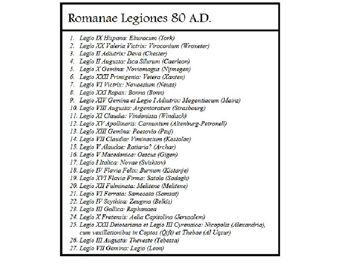 26. Legio III Augusta; Theveste (Tebessa, Algeria) 27. Legio VII Gemina; Legio (Léon, Spagna)