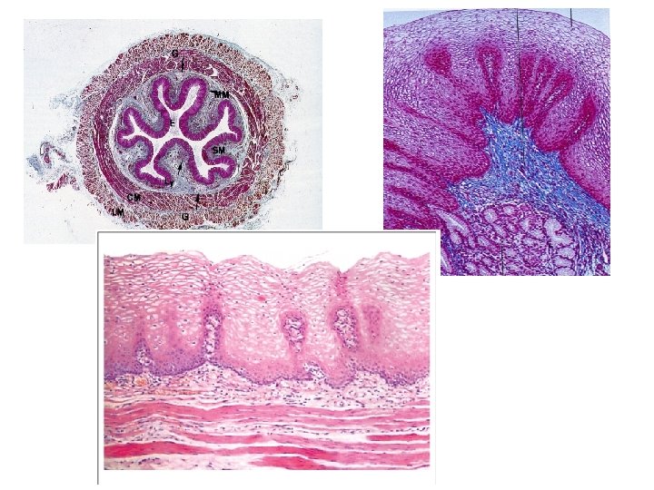 ESÓFAGO: RECUERDO DE LA HISTOLOGÍA • Tubo muscular que transcurre desde la faringe hasta el estómago • Función: permitir el paso del alimento y evitar el reflujo desde estómago • 25 cm, dos zonas estenóticas: – Aorta – Entrada al estómago • Mucosa: epitelio escamoso estratificado no queratinizado • Submucosa: – Vasos sanguíneos, linfáticos, nervios • Capa muscular: – Primeros 12 cm músculo estriado – A partir de ahí, capa muscular circular (interna) y longitudinal (externa)