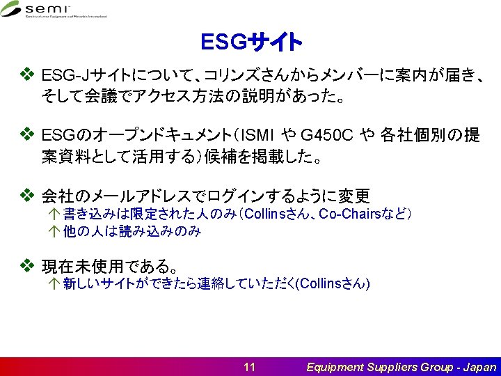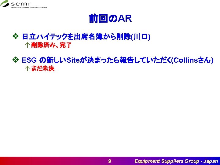 Summary and ARs v ESG の新しいSiteが決まったら報告していただく (AR)Collinsさ ん 37 Equipment Suppliers Group - Japan