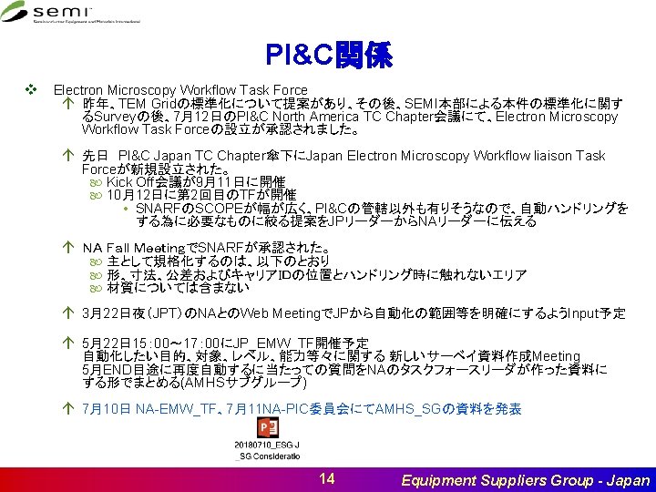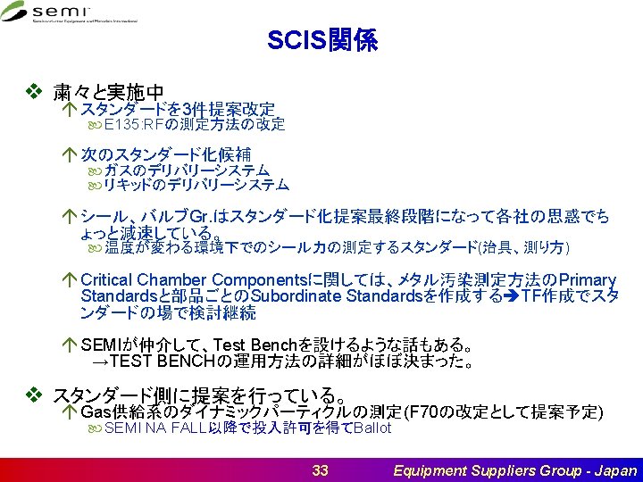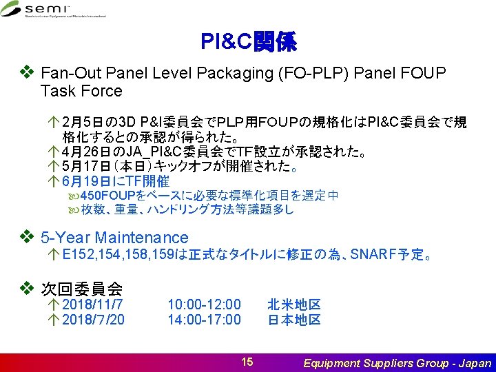 I&C関係 v CMS (Japan: Doc. #6319) [Update無し] á E 87にRelated Documentとして、E 171 PCLを追記する提案 á Cycle 2投入、4月委員会を通過。 v Factory全体で装置にユーザ管理を行う活動を開始 (JA: Doc. #6092) [Update 無し] á CUARAM(Centralized User Authentication and Role Authorization Management)のSNARF が10月21日日本地区委員会で承認された。 á 本スタンダード化について、意見を聞く調査を実施中。 v Predictive Carrier Logistics[Update無し] á E 170. 1のStream Function化終了後(E 5のタイトル変更後)、E 171. 1のStream Function化を実 施する。 v Guide for EDA Freeze Version(JP: Doc. #6300) á Doc. #6300 Cycle 2投入、4月委員会でFail。Cycle 6に投入予定で準備中。 v I&CC会議 á á á 日本 北米 韓国 台湾 EU 7月27日(金) 13: 00 -17: 00 11月7日(水) 8: 00 -12: 00 10月19日(金) TBD 9月 TBD [SEMICON Europa併設] 11月 TBD 22 Equipment Suppliers Group - Japan