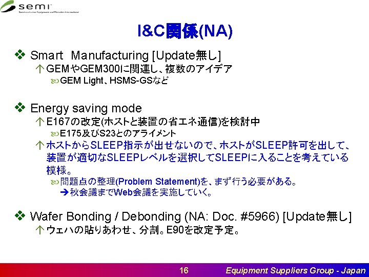 I&C関係(台湾) v Specification of Backend Die Traceability (Taiwan: Doc #6147) [Update無し] á BackendのSNARFが2017年 1月委員会で承認された。 First Draft 5月25日 Ballot 11月16日 Approval 2019年 5月24日 20 Equipment Suppliers Group - Japan