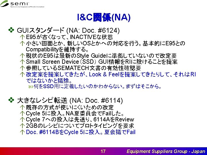 I&C関係 v SFORMS: Secured Foundation of Recipe Management System (Japan: Doc. #6375, #6377) á E 170 Application Study WG設立 東芝四日市+IBMでのホスト側検討+装置メーカ側検討実施中。 á SNARF #6375(E 170+E 170. 1の改定) á SNARF #6377(E 5の改定) á Doc. 6375をCycle 5に投入。Reject 3。 á 7/26 JA GEM 300 TFでレビュー、7/27委員会で審議予定。 v Wafer Job Management (Japan: Doc. #6202) á 2017年サイクル 2で投票完了。4月21日日本地区委員会通過。 E 1740817 として出版済み á 改定SNARFを 6月8日の委員会で承認済(#6202) á 2017年Cycle 8へ投入 Pass A&R in January, 2018 á 2018年 6月に出版 21 Equipment Suppliers Group - Japan