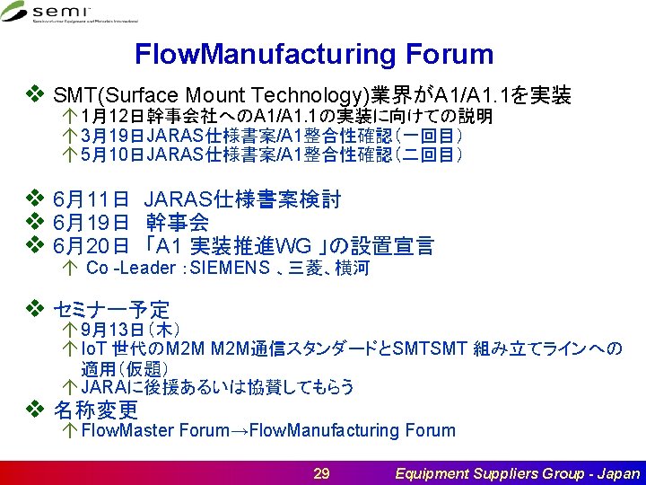 AT(Automation Technology)関係 v A 1 & A 1. 1 Horizontal Communication改訂 á Ratification Ballot (#R 6329)をCycle 5に投入 通過した á 7/24の委員会でLine Item RevisionのSNARFを提案予定 SMTへの適用により改訂要 v SMT関連 á SMT TF設立 (4/20の委員会で承認された) á New Standard: SPECIFICATION FOR SURFACE MOUNT ASSEMBLY SMART HOOKUP (SMASH) (#6329)開発開始 v Doc. #6263 A PCBECI (台湾) á 4/26の委員会でCycle 5への投入完了、投票完了。 v 次回委員会 á JA á 台湾 á EU 7月24日 8月9日 未定 13: 30 -17: 00 14: 00 -16: 00 27 Equipment Suppliers Group - Japan