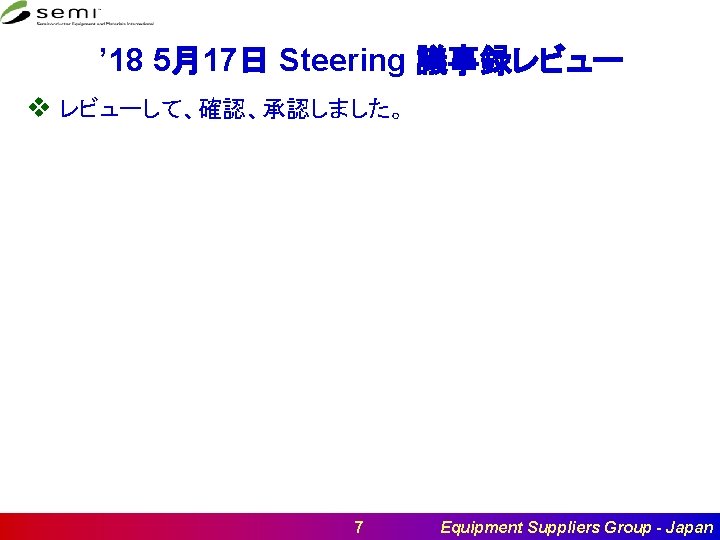 目次 v v v v Status of Participation to Official Meeting(2015 -2018) 出席者 Self Introduction Membership and Leadership Special Interest Group Meeting Elements ’ 18 5月17日 Steering 議事録レビュー 前回AR確認 ESG Operation á ESG-J Overviewレビュー á ESGサイト Standards Meetings á PI&C関連 á HB-LED and 3 DS-IC á AT関連 Flow. Master Forum DM and ESG Meeting á DMとのコミュニケーションについて 業界の状況 á SCISの状況 Summary and ARs Next Meeting 2 Equipment Suppliers Group - Japan
