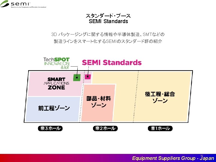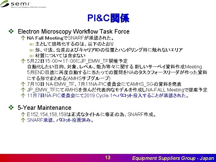 Next Meeting v 次回: 2019年 1月29日(火) 14: 30 -17: 00 v 場所: SEMIジャパン Room 2 á EQ SG á AMHS SG 13: 30 -14: 30 @Room 3 13: 30 -14: 30 @Room 2 v 目的: á スタンダード状況 PI&C関連 Automation Technology関連 HB-LED and 3 DS-IC その他(あれば) á Flow Master Forum á 業界の状況 41 Equipment Suppliers Group - Japan