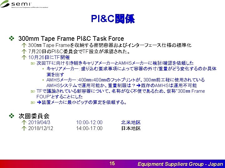 PI&C関係 v Fan-Out Panel Level Packaging (FO-PLP) Panel FOUP Task Force á 6月19日にTF開催 450 FOUPをベースに必要な標準化項目を選定中 枚数、重量、ハンドリング方法等議題多し á 標準化項目のサーベイを実施中 á 11月6日NA-FALL MeetingでTF開催 SNARFに関する確認が実施された • SCOPEは以下の内容となる予定 – Panel FOUPのデザインはPanel Sizeはdoc. 6332に準ずる – Door interface – Bottom interface – Maximum outer size of FOUP for various panel sizes. – 2 Slot type: 12 slot and 6 slot (Note: Maximum slot numbers is limited by height) – AMHS Interface – Carrier ID: RF-ID only 14 Equipment Suppliers Group - Japan