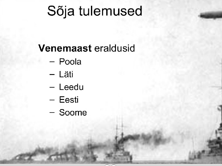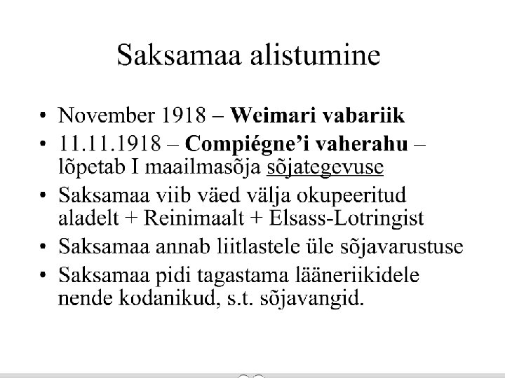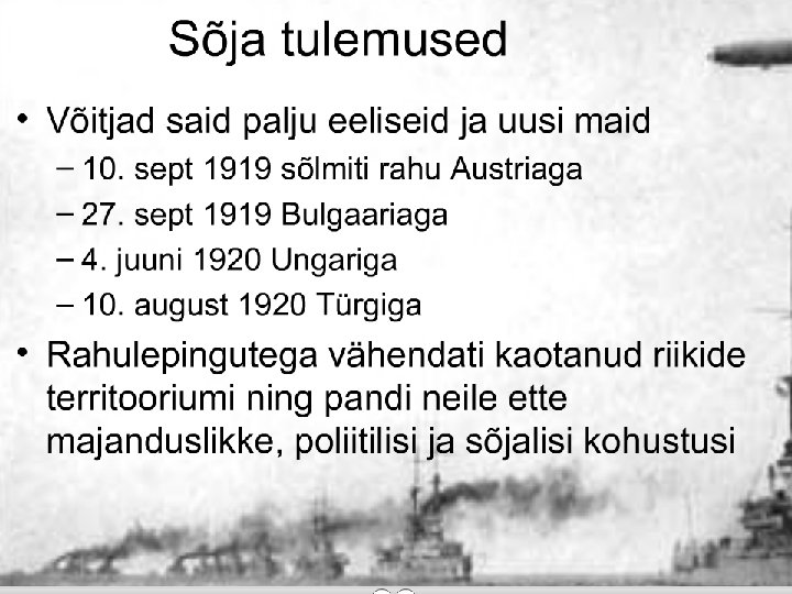 1918 • Venemaa väljumine võimaldab Saksamaal suurem osa oma vägedest ümber paigutada läänerindele. • Saksa väed on kurnatud ja ta ei suuda Antanti rünnakutele vastu panna. • 11. 1918 kirjutatakse alla Compiegne`i vaherahule: Lõpetab Esimese maailmasõja. Suurim kaotaja on Saksamaa! Bresti rahu kaotab kehtivuse, Venemaa võitjariikide poolel.
