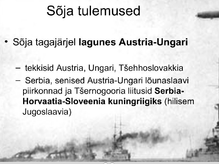 Meeldetuletuseks Sõdivad pooled: Antant- Inglismaa, Prantsusmaa, Venemaa Kolmikliit-Austria-Ungari, Saksamaa, Itaalia Sõja ajend: Serbia salaorganisatsioon mõrvab Austria. Ungari troonipärija. Austria-Ungari kuulutab sõja Serbiale.