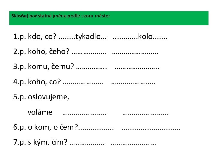 Řešení: Skloňuj podstatná jména podle vzoru město: 1. p. kdo, co? . . . . tykadlo. . . . kolo. . . . 2. p. koho, čeho? . . tykadla… …………. kola…. . . 3. p. komu, čemu? …tykadlu. . ………kolu…. . 4. p. koho, co? …tykadlo… …………kolo. 5. p. oslovujeme, voláme ……tykadlo. ………kolo. . . 6. p. o kom, o čem? . tykadle. . . kole. . . . . 7. p. s kým, čím? . . tykadlem. . …kolem……