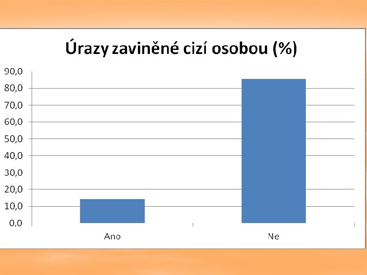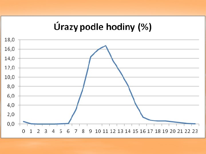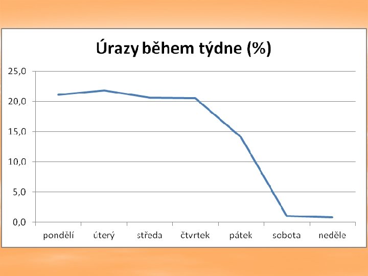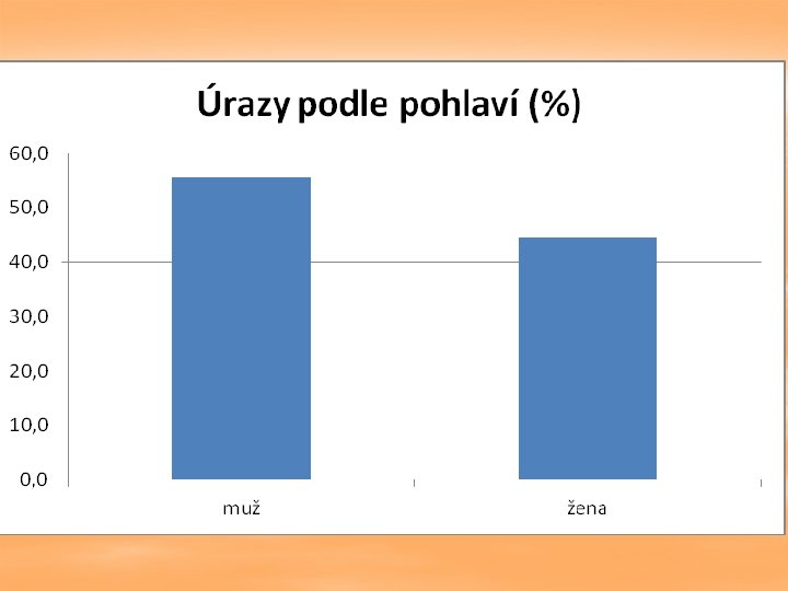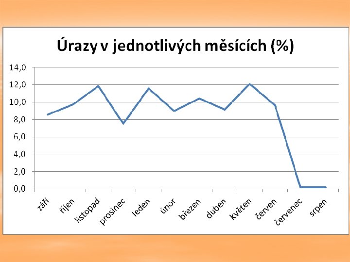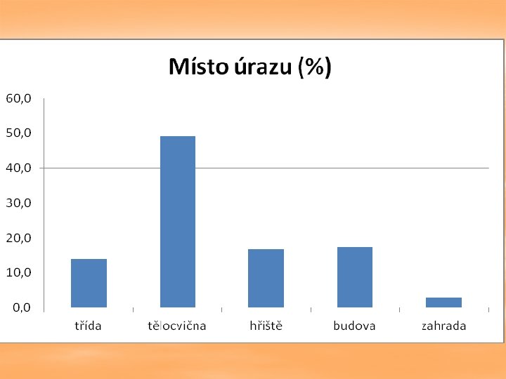 Úrazy podle místa (v %) mš zš sš voš ostatní CELKEM třída 25, 7 16, 6 5, 4 2, 3 5, 7 13, 9 tělocvična 2, 2 47, 3 59, 4 45, 5 40, 8 49, 1 hřiště 8, 0 16, 8 17, 1 18, 2 27, 2 16, 8 chodba 15, 4 18, 0 15, 6 29, 5 19, 3 17, 4 zahrada 48, 8 1, 3 2, 5 4, 5 7, 0 2, 8