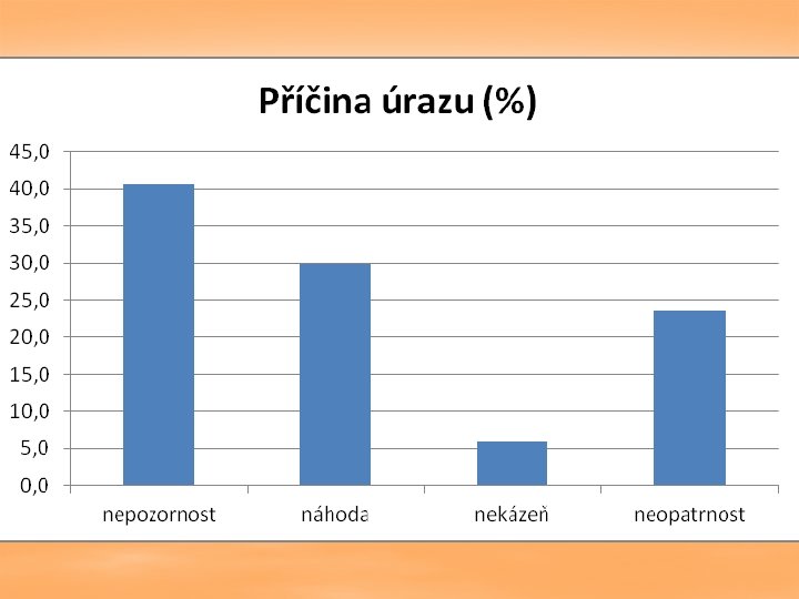 Příčiny úrazů (v %) Příčina mš zš sš voš ostatní CELKEM nepozornost 64, 0 38, 5 43, 7 45, 5 46, 7 40, 7 náhoda 18, 1 30, 9 29, 0 24, 2 21, 0 29, 9 nekázeň 5, 5 7, 5 1, 5 9, 1 5, 9 neopatrnost 12, 4 23, 1 25, 8 21, 2 27, 2 23, 6