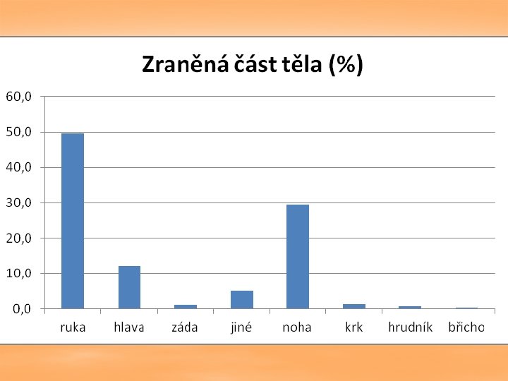 Nejčastěji zraněná část těla (v %) Část těla mš zš sš voš ostatní CELKEM ruka 38, 5 51, 2 47, 5 42, 6 47, 3 49, 8 hlava 36, 4 12, 6 8, 8 14, 8 12, 2 záda 0, 2 1, 1 1, 4 0, 0 1, 1 1, 2 jiné 10, 3 5, 3 4, 8 7, 4 5, 0 5, 3 noha 12, 0 27, 5 35, 3 38, 2 30, 2 29, 3 krk 0, 7 1, 2 1, 4 0, 0 0, 7 1, 3 hrudník 1, 5 0, 7 0, 5 0, 0 0, 9 0, 7 břicho 0, 4 0, 2 2, 9 0, 0 0, 4