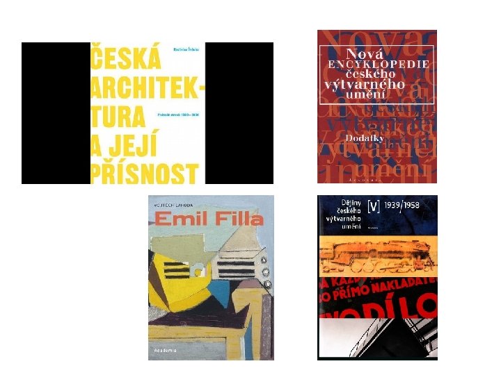 Ústav dějin umění Akademie věd ČR • Dějiny českého výtvarného umění, nakl. Academia, Praha díl I, Od počátků do konce středověku, 1984 díl II, Od počátků renesance do závěru baroka, 1989 díl III, 1780 -1890, 2001 díl IV, 1890 -1938, 1998 díl V, 1939 -1958, 2005 díl VI, 1958 -2000, 2007 • Další projekty: Nová encyklopedie českého výtvarného umění, ed. Anděla Horová, 1995; Dodatky, 2006 – umělecké topografie Prahy, Moravy a Slezska – čsp. Umění, Estetika aj. • Autoři pojednání o ČVU po 1945: Polana Bregantová, Lenka Bydžovská, Antonín Dufek, Pavel Halík, Jiří Hilmera, Dagmar Koudelková, Petr Kratochvíl, Vojtěch Lahoda, Terezie Petišková, Eva Petrová, Marie Platovská, Rostislav Švácha (hlavní editor) a jiní.