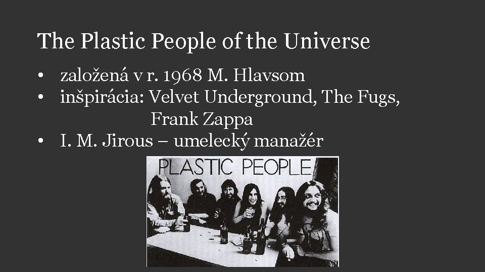 The Plastic People of the Universe • založená v r. 1968 M. Hlavsom • inšpirácia: Velvet Underground, The Fugs, Frank Zappa • I. M. Jirous – umelecký manažér