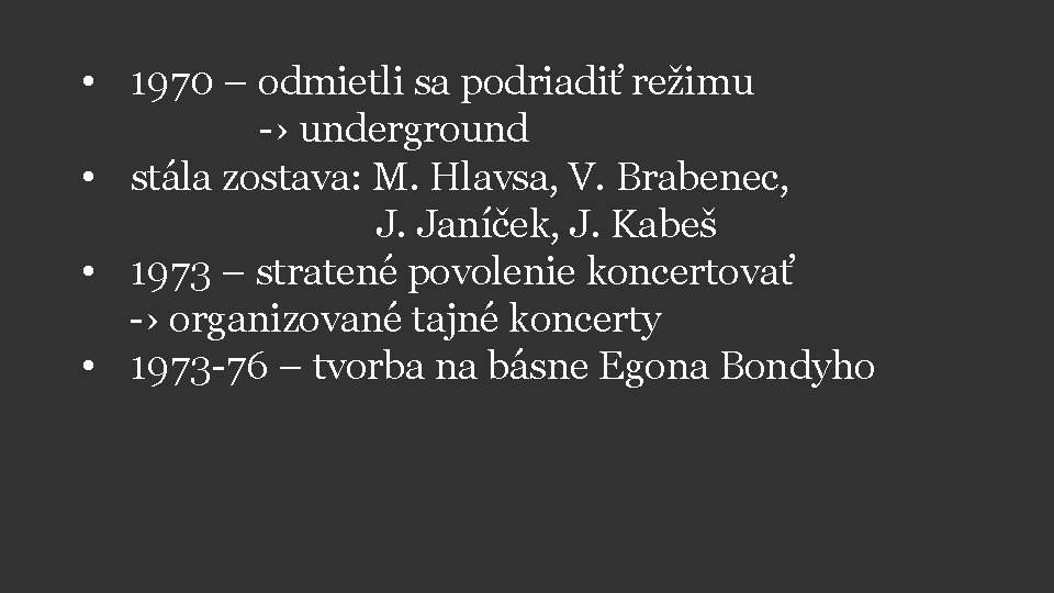 • 1970 – odmietli sa podriadiť režimu -› underground • stála zostava: M. Hlavsa, V. Brabenec, J. Janíček, J. Kabeš • 1973 – stratené povolenie koncertovať -› organizované tajné koncerty • 1973 -76 – tvorba na básne Egona Bondyho
