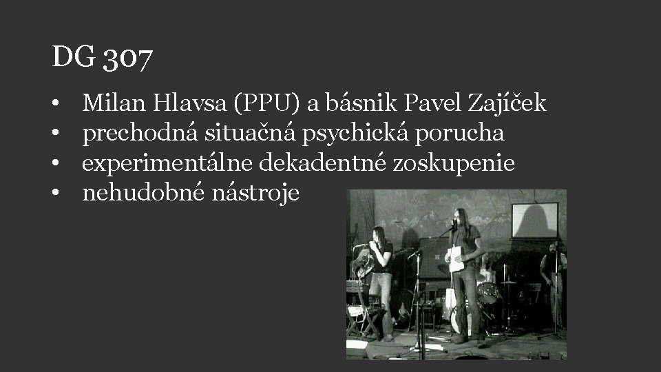 DG 307 • • Milan Hlavsa (PPU) a básnik Pavel Zajíček prechodná situačná psychická porucha experimentálne dekadentné zoskupenie nehudobné nástroje