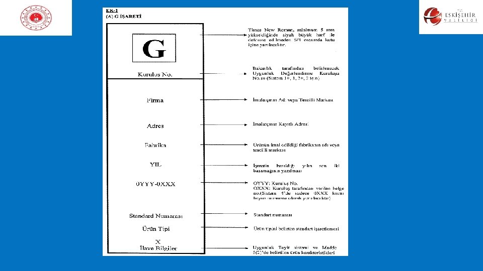 CE İŞARETİ Onaylanmış Kuruluş Var İse, • CE İşareti 1783 • AB Komisyonu’nun Onaylanmış Kuruluş No. su • Üretici A. Ş. P. K. 01, İstanbul 80230 • TR • Üreticinin Adresi • 03 • CE İşaretinin iliştirildiği yılın son 2 hanesi • 1783 -CPD-055 • Sertifika no : • Onaylanmış kuruluş no/CPD(YMY)/Seri no. • EN 12345 • 80 mm Mineral yün binalar için • Yanıcılık sınıfı – B Sınıfı • Isı iletkenliği – 0. 04 W/m. K • Bükülme gerilme direnci – NPD • Malzeme Standardı • Malzeme Verisi • NPD - No Performance Determined