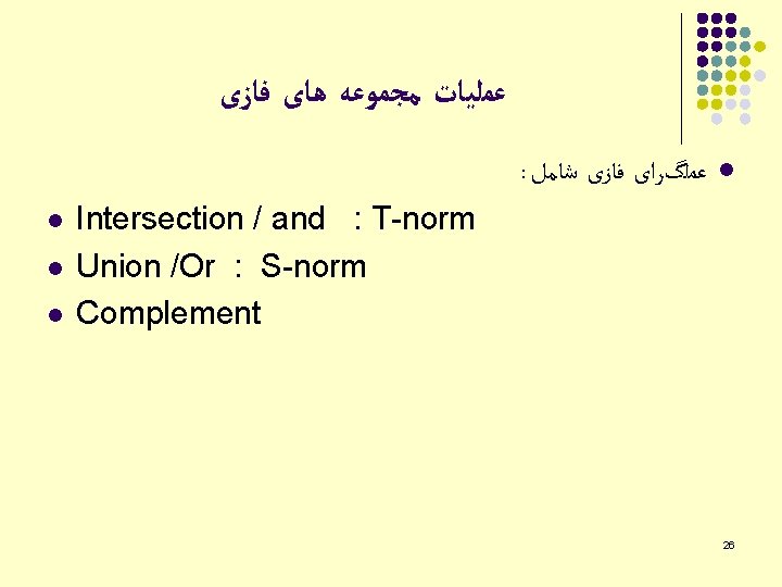 ﻣکﻤﻞ ﻓﺎﺯی l Fuzzy complement (fuzzy Not) Not A= 1 - A(x) = 1 A(x) 29