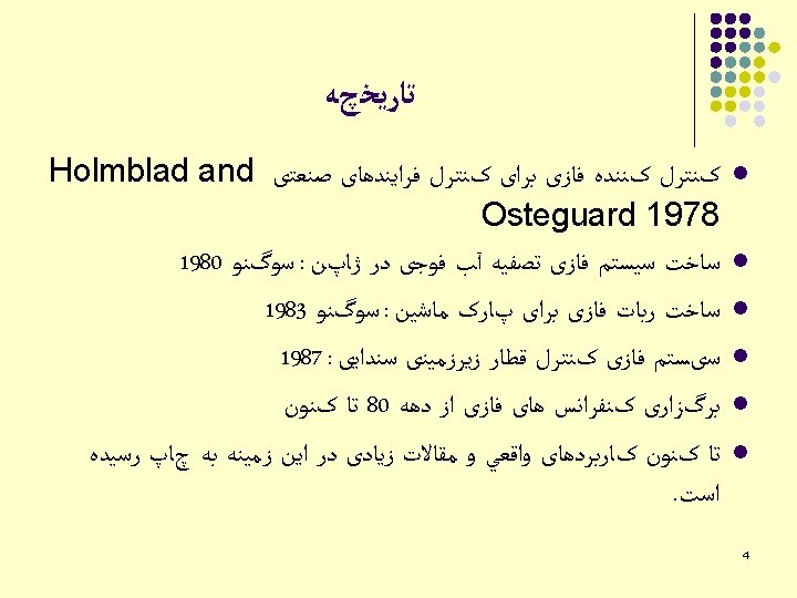 ﺗﺎﺭﻳﺨچﻪ l l In 1965, Lotfi Zadeh published his famous paper “Fuzzy sets”. In 1973, Lotfi Zadeh published his second most influential paper about fuzzy rules. 3