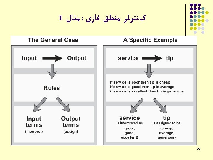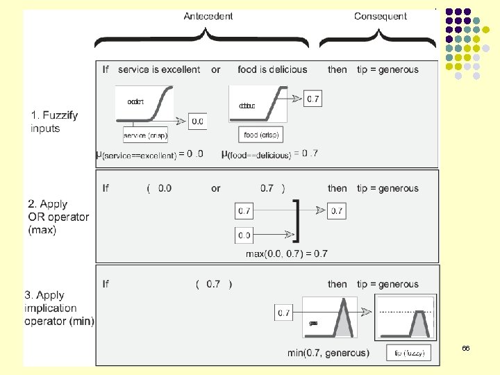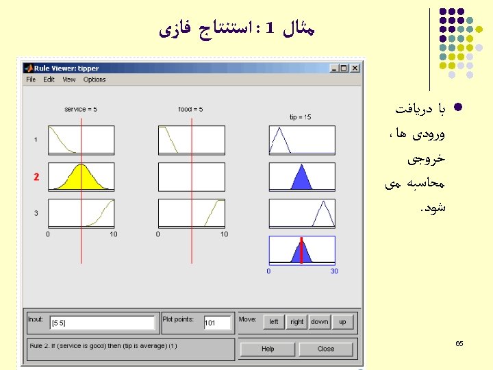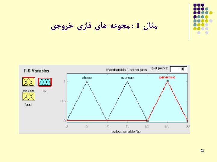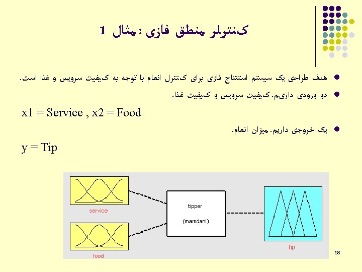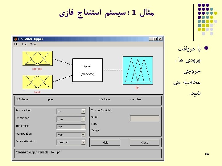 ﻗﻮﺍﻧﻴﻦ ﻓﺎﺯی : 1 ﻣﺜﺎﻝ l If (service is poor) or (food is rancid) then (tip is cheap) (1) l If (service is good) then (tip is average) (1) l If (service is excellent) or (food is delicious) then (tip is generous) (1) 63